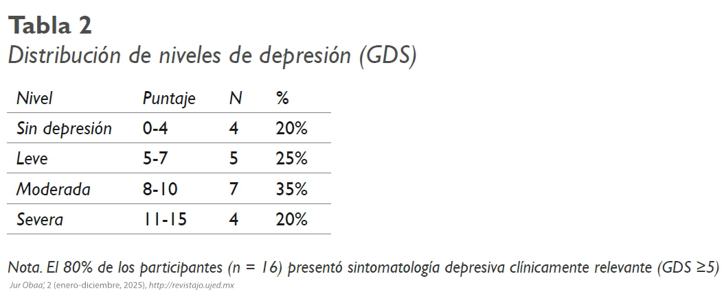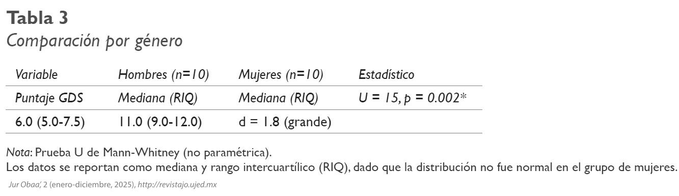 El presente estudio analiza la presencia de depresión geriátrica en personas adultas mayores asistentes a una casa de día en Durango, comparando los niveles según el género mediante la Escala Geriátrica de Depresión (GDS-15). Participaron 20 adultos mayores (10 mujeres y 10 hombres). Los resultados muestran una alta prevalencia de sintomatología depresiva (80 %), siendo significativamente mayor en mujeres (p = 0.002). Se discuten factores biopsicosociales y roles de género como posibles explicaciones. Se concluye la necesidad de intervenciones diferenciadas por género y mayor atención a la salud mental en contextos institucionales.
